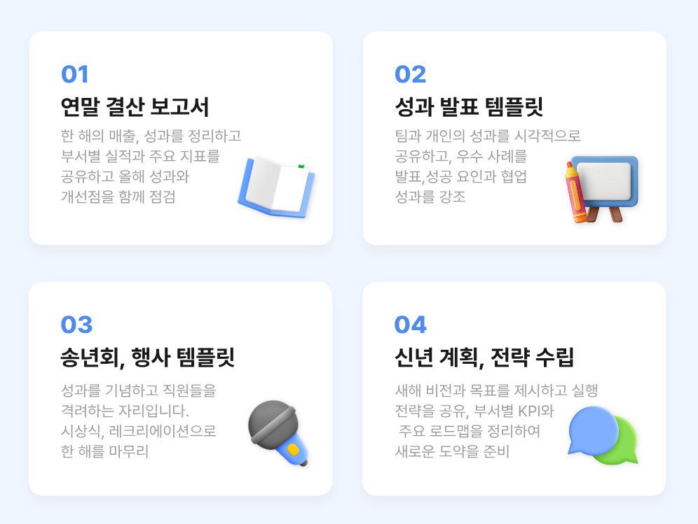 올해의 마지막인 4분기는 성과를 정리하고 한 해의 여정을 되돌아보는 중요한 시기입니다. 프로젝트 결과와 팀의 성장, 그리고 배운 점들을 체계적으로 정리해두면 다가오는 새해를 준비하는 데 큰 힘이 됩니다. 특히 연말이 다가올수록 결산 보고서와 성과 발표를 위한 PPT 템플릿 자료가 필수적으로 필요합니다.