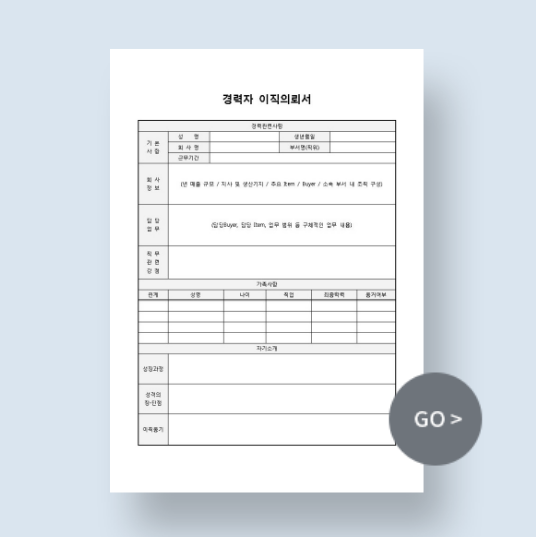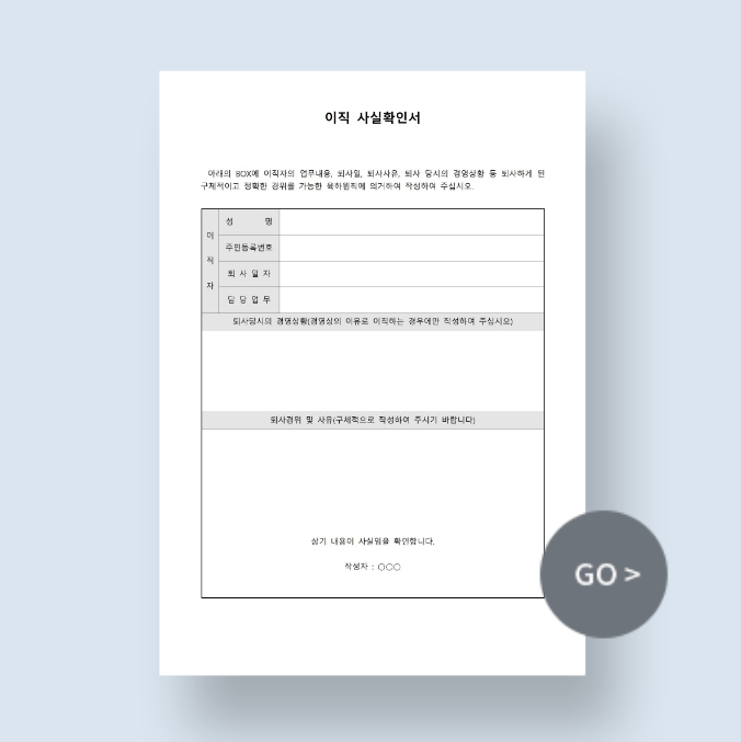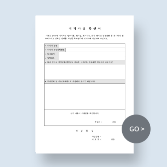 이직 준비, 막막하고 복잡하게만 느껴지시나요? 서류 하나하나 준비하다 보면 정작 중요한 직무 준비에 집중하기 어려울 수 있습니다. 비즈폼의 이직 관련 서식으로 서류 준비 시간은 줄이고, 경쟁력 있는 이직 준비에 집중하세요! 😉