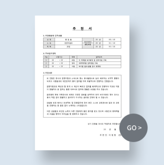 새로운 기회를 잡기 위한 강력한 무기! 대표이사나 임원이 성실하게 근무한 내역을 평가하여 작성하는 전문가 감수 추천서입니다.