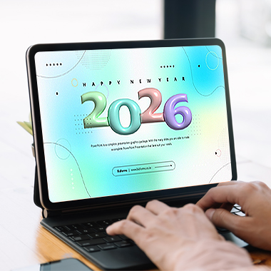 다채로운 색감과 3D 효과 디자인으로 2026년의 활기찬 시작을 표현한 템플릿입니다. 신년 계획 발표와 같은 주제에 잘 어울립니다