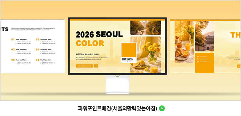 2026년, 서울의 색으로 모닝옐로우(Morning Yellow)가 선정되었습니다. 이 색은 매일 아침 서울시민의 하루를 여는 아침 해☀️의 따뜻한 빛에서 영감을 받아 탄생했으며, 희망과 시작을 상징합니다. 모닝옐로우를 포인트 컬러로 활용한 PPT 템플릿은 시각적인 집중도를 높이고, 새로운 계획과 아이디어를 더욱 명확하고 생동감 있게 전달하는 데 효과적입니다.
