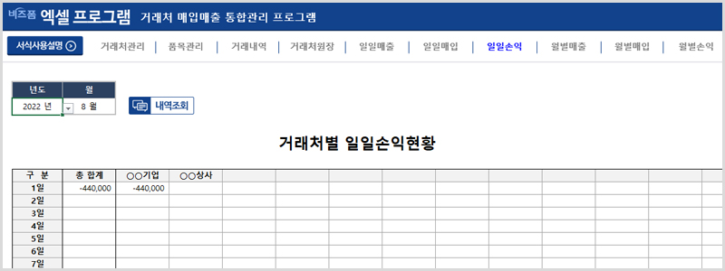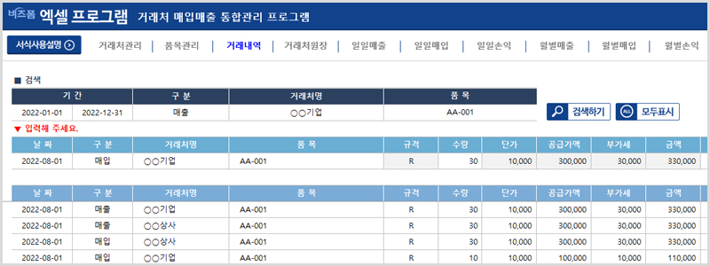 거래일자 / 거래처명 / 거래품목 / 규격 및 수량 / 단가 및 최종금액 등을 표시한 뒤 등록하면 해당 거래가 등록되며, 이를 바탕으로 일별/월별 매입매출과 거래처원장을 확인할 수 있습니다.